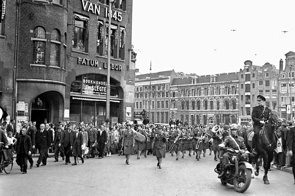 The Canadian Women’s Army Corps Brass Band en route from the Royal Palace to the City Theatre, Amsterdam, Netherlands, 25 July 1945.