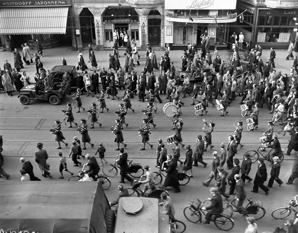 Canadian Women’s Army Corps Pipe Band parading through Amsterdam, Netherlands, 17 October 1945.
