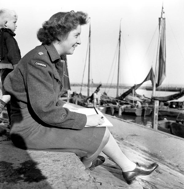 War artist 2nd Lieutenant Molly Lamb, Canadian Women’s Army Corps, sketching at Volendam, Netherlands, 12 September 1945.