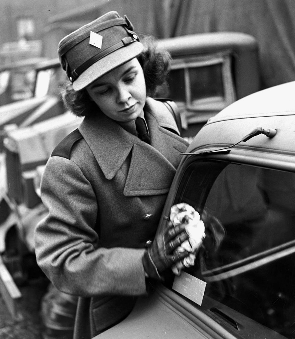 CWAC driver cleaning her staff car, Dec 1941.