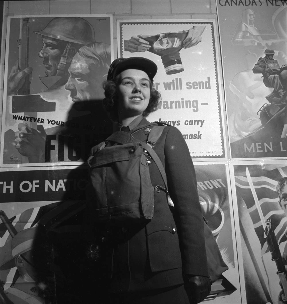 CWAC wearing a greatcoat and gas mask carrier in front of recruiting posters, ca 1943.