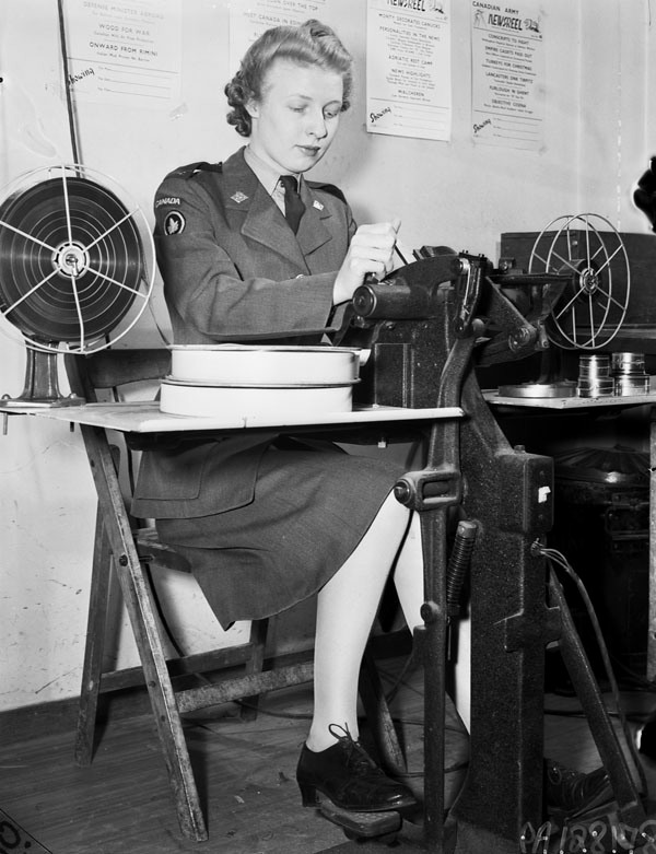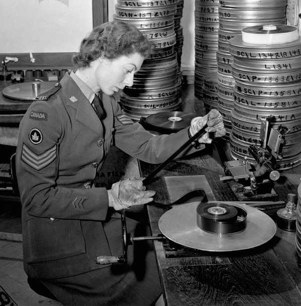 Sergeant Margaret O. King of the Canadian Army Film and Photo Unit operating an editing machine in the film library at Merton Park Studios, London, England, 19 December 1944.