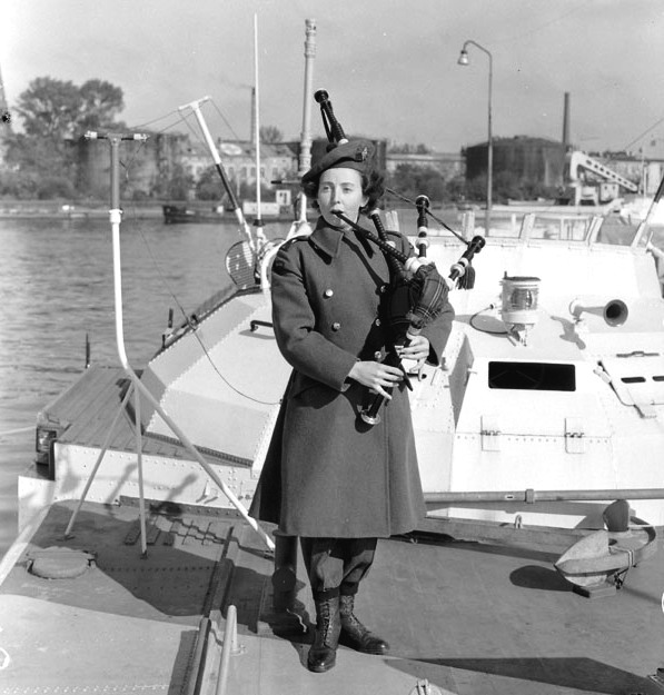 Piper Flossie Ross of he Canadian Women’s Army Corps Pipe Band on the deck of a surrendered German E-boat, Wilhelmshaven, Germany, 4 October 1945.