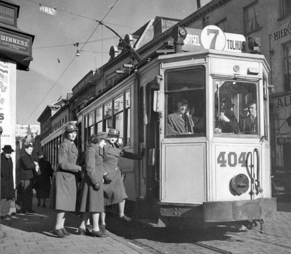 Corporals Eileen Sainsbury and Rita Moffat and Private Christina Gray, all of the Canadian Women’s Army Corps, boarding a streetcar, Antwerp, Belgium, 28 October 1944.