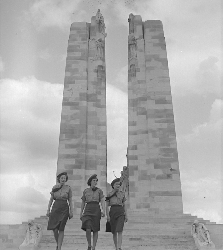 Three CWACs at Vimy Ridge, L to R: Pte. Dorothy Allen, Sgt. Helen Strickland and Pte. Terry Marucci, 20 June 1945.