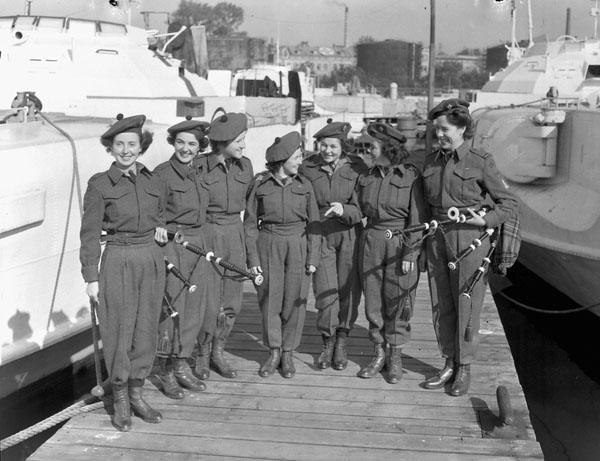 Members of the Canadian Women’s Army Corps Pipe Band, alongside captured German E-boats, Wilhelmshaven, Germany, 4 October 1945.