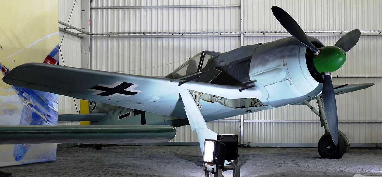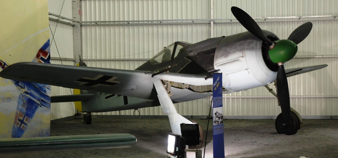 Focke-Wulf Fw 190A-8 (Wk. Nr. 730923), a French NC.900, No. 62 modified to represent an A-7. It is painted in the colours of Oberst Josef Priller, Luftwaffe Kommodore of JG 26, who accumulted 101 victories, many of them in Fw 190s. Musée de l'Air et de l'Espace, located at the south-eastern edge of Le Bourget Airport, north of Paris.