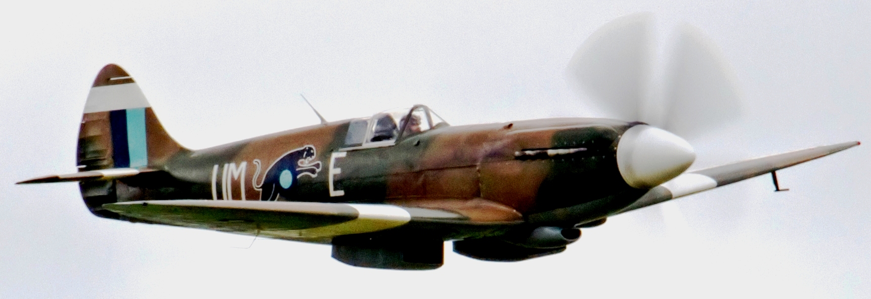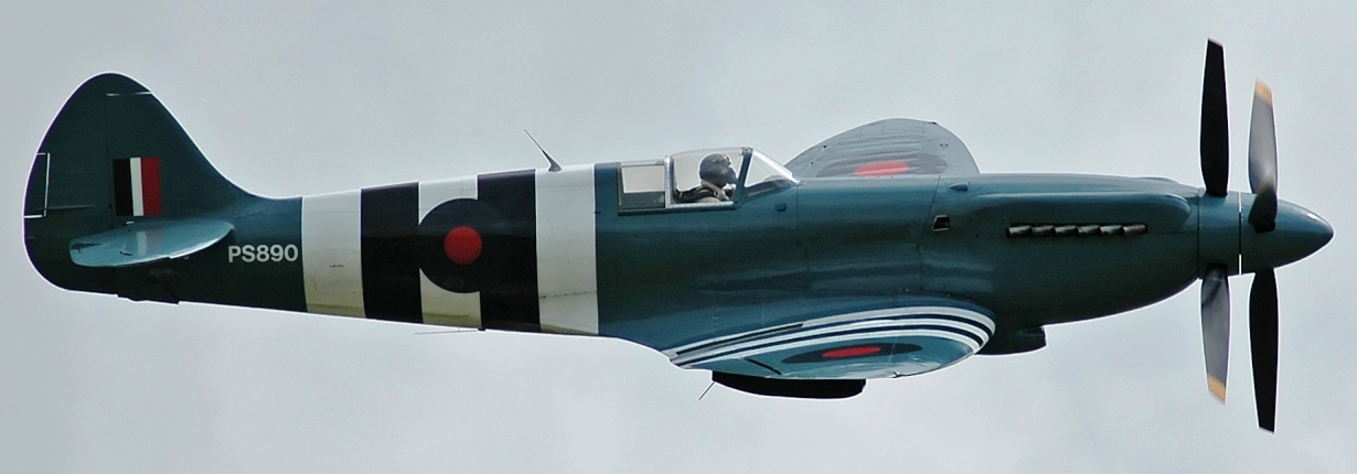Supermarine Spitfire PR Mk. XIX (Serial No. PS890), c/n 6S/585110. This aircraft wears the markings of a Mk. XIV operated by No. 152 Sqn, SEAC. Built as a PR .XIX with a Griffon 66 engine at Supermarine Aviation(Vickers) Ltd. in 1944 and given production prototype engine mount modifications on 29 November 1944, arriving at 6 Maintenance Unit on 9 April 1945. She was moved to RAF Benson (PRU) for storage on 30 April 1945. PS890 joined 542 Squadron on 13 June 1945 followed by 81 Squadron at Seletar, Singapore on 22 January 1951. She was transferred to The Royal Thai Air Force as U14-26/97 on 3 June 1954. In 1962 she was donated by King Bhumibel of Siam to Ed Maloney of the Air Museum at Claremont, California, and put into storage. During a rebuild PS890 was fitted with a Shackleton engine and retained contra-rotating propellers flying again in May 2002 and operated by Planes of Fame, Chino. In 2005 Christophe Jacquard acquired her and based her in Dijon-Darois.